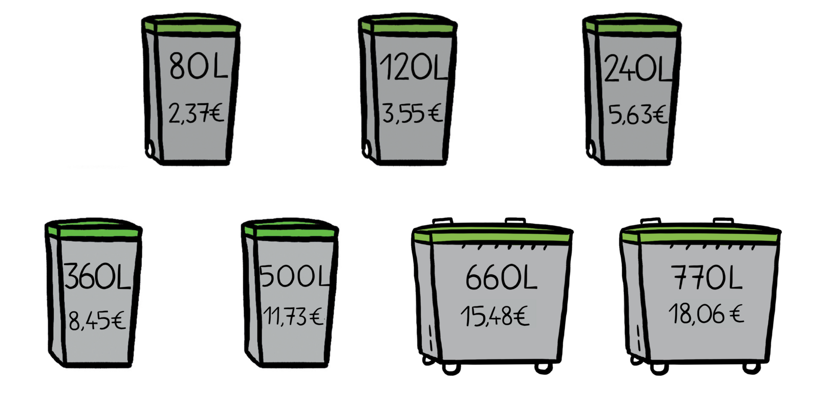 La tarification éco-responsable est due à chaque fois que le bac est présenté à la collecte, le tarif dépend du volume du bac (ce volume est indiqué sur votre bac, au niveau de l’étiquette adresse) :