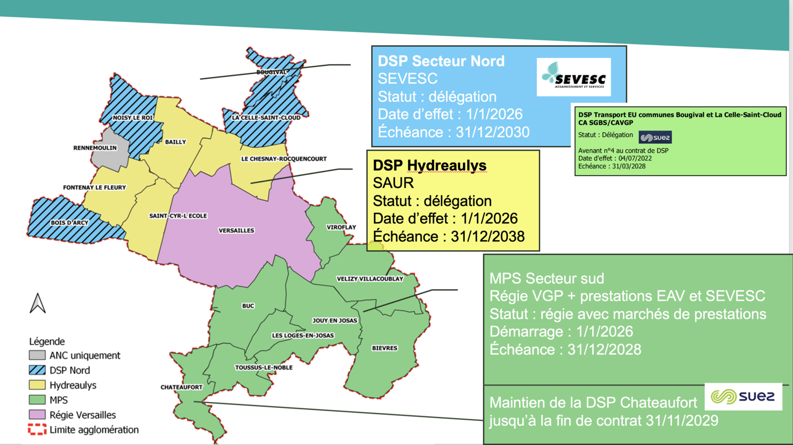 Depuis le 1er janvier 2026, Versailles Grand Parc a adopté une organisation renouvelée pour la gestion de la collecte des eaux usées et pluviales. Deux territoires distincts sont mis en place : le secteur Nord, confié à la société SEVESC dans le cadre d’une délégation de service public (DSP), et le secteur Sud, géré en régie par la communauté d'agglomération avec le soutien de marchés de prestation de services.