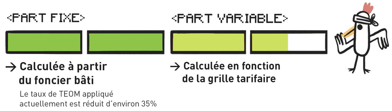 Pour mémoire, la tarification éco-responsable remplace la taxe d’enlèvement des ordures ménagères (TEOM) et est payée via la taxe foncière. Elle est composée :