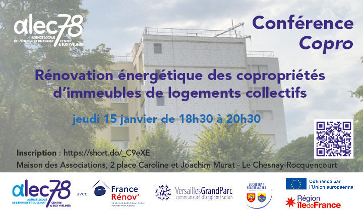 Cette conférence Rénovation énergétique des parties communes des copropriétés d'immeubles de logements collectifs, destinée aux habitants, membres d’un conseil syndical et des Syndics des copropriétés d’immeubles de logements collectifs, sera assurée par un conseiller France Rénov’ de l’ALEC 78.