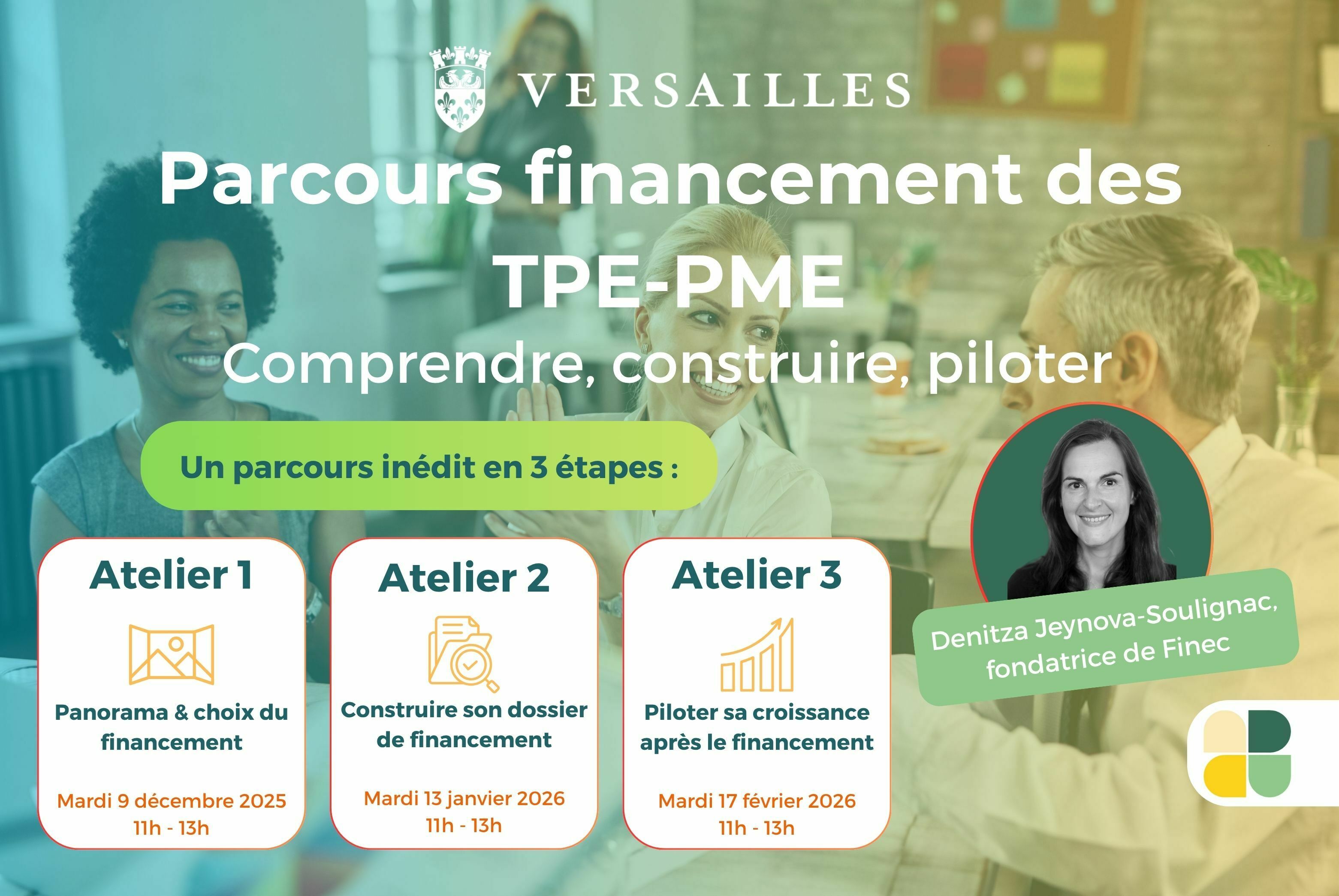 La Ville de Versailles vous invite à un parcours exclusif dédié au financement des TPE-PME. Au fil de trois ateliers complémentaires, vous apprendrez à :