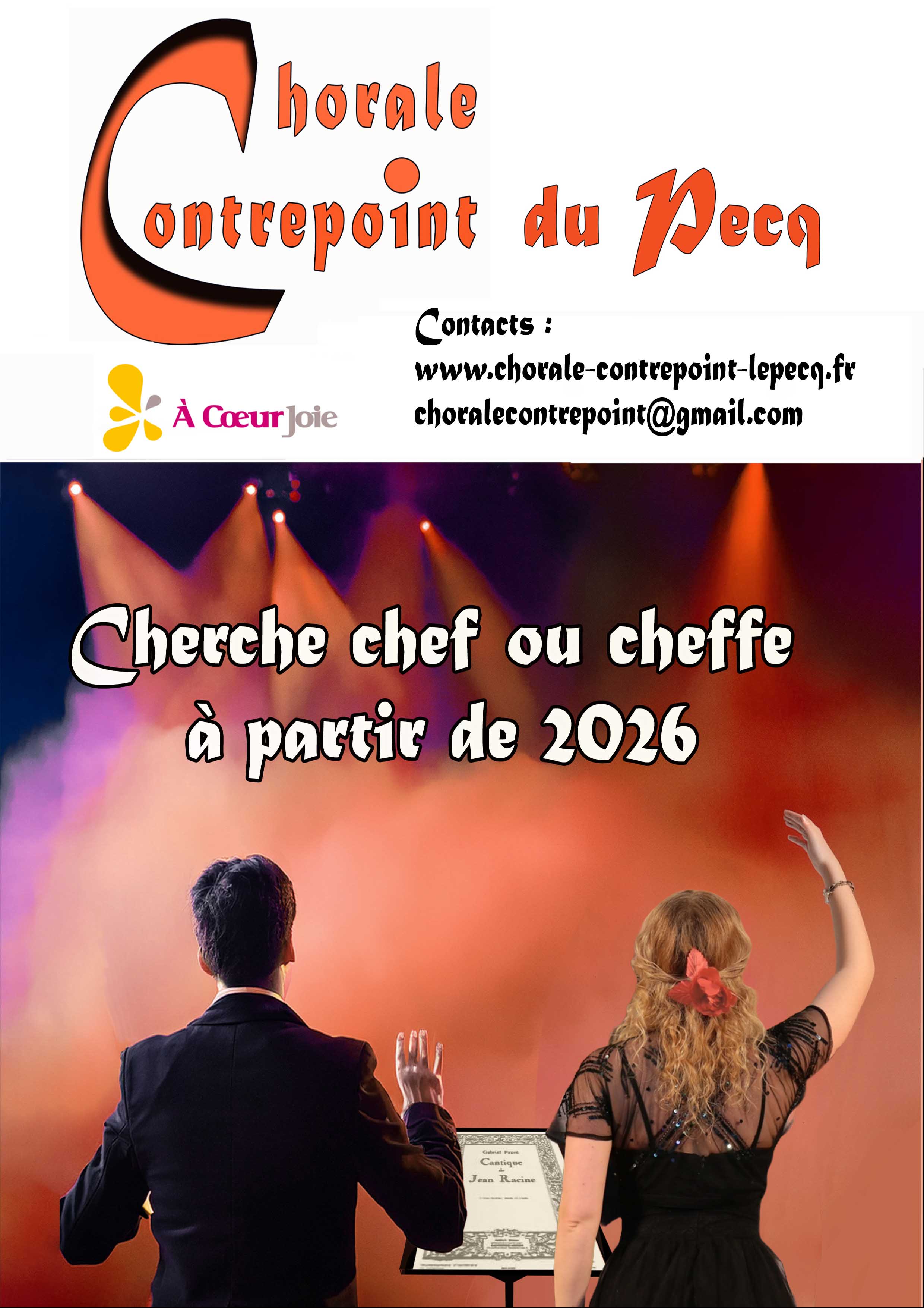 La chorale Contrepoint du Pecq (chorale à Cœur Joie) recherche un(e) chef(fe) de chœur pour la rentrée 2026. Tous les renseignements sont disponibles sur le site de la chorale