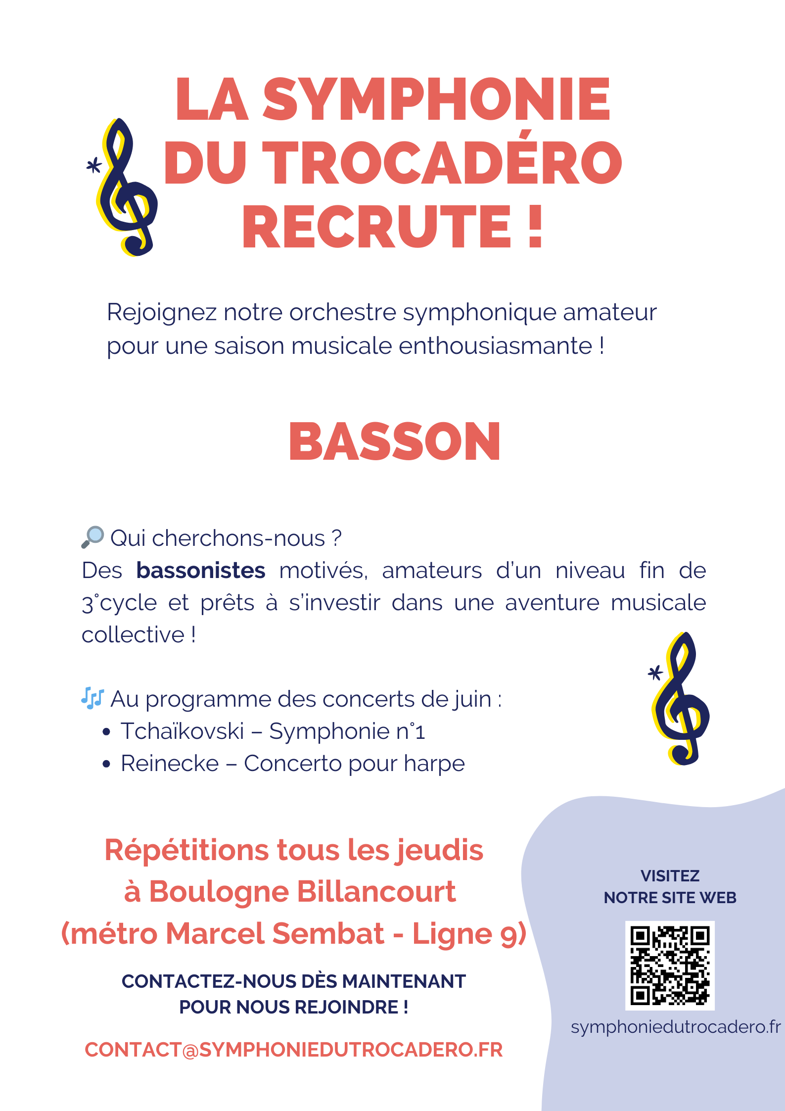 La Symphonie du Trocadéro, orchestre symphonique amateur basé à Boulogne Billancourt recherche Bassonistes. (voir affiche)