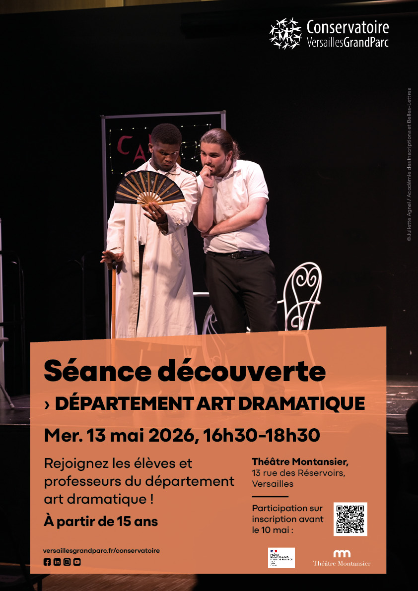 ► Séance découverte du 1er au 3ème cycles : mercredi 13 mai 2026, 16h30-18h30 au Théâtre Montansier. Participation sur inscription : Participation à la séance découverte du département art dramatique - Rentrée 2026-27 – Remplir le formulaire