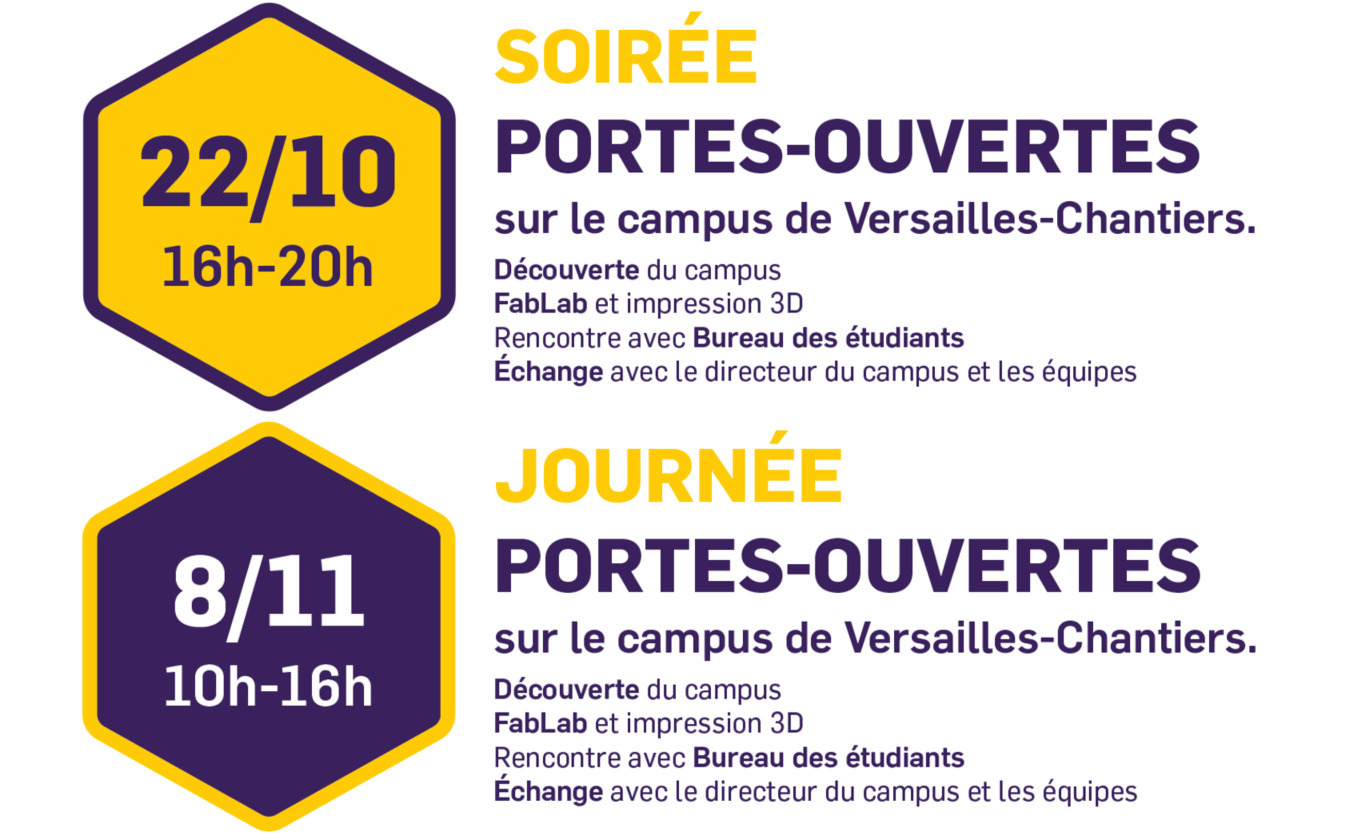 Rendez-vous le mercredi 22 octobre 2025, de 16h à 20h ou le samedi 8 novembre 2025, de 10h à 16h, sur le campus de Versailles-Chantiers pour découvrir l’École Hexagone :